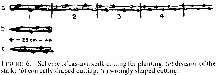 Experiments in the Philippines on the relation between the age of cuttings and yields showed that cuttings taken 75 cm or more below the apex of the stem gave the best starch yields. Other experiments concluded that older wood from the basal areas to the midpoint of the stems outyielded apical propagating material.