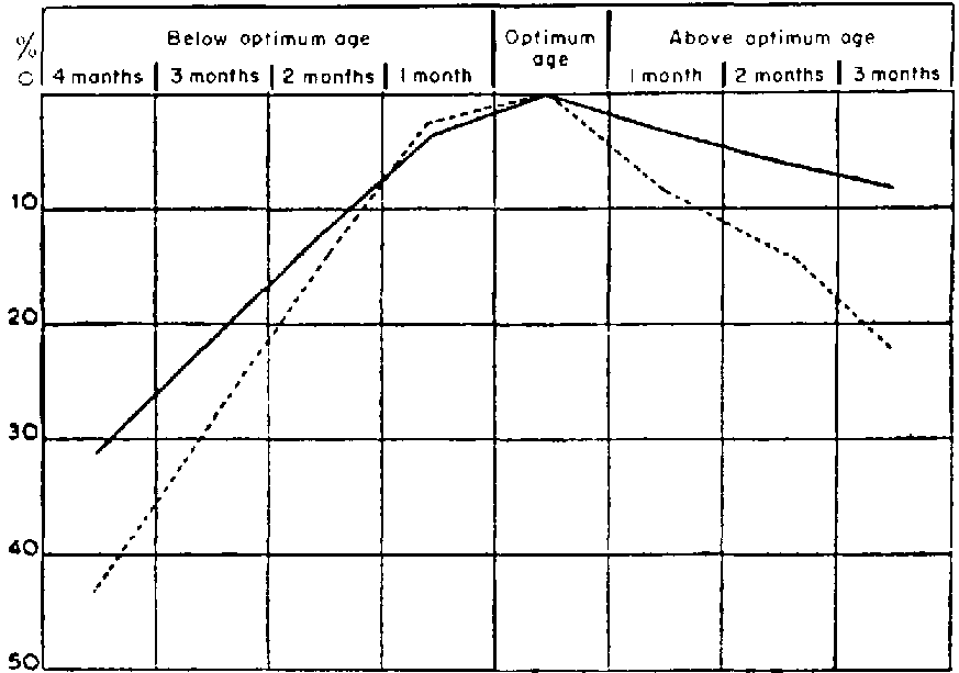 From the standpoint of starch production, cassava should be considered ripe when the yield of starch per hectare is highest. An optimum age of 18-20 months was found in experiments with certain strains of the variety "São Pedro Preto" in a tropical climate (Java). The graph in Figure 7 shows the influence of the age at harvesting on the starch yield as the percentage loss of yield in relation to the yield at the optimum age as found in an experiment with a definite strain.