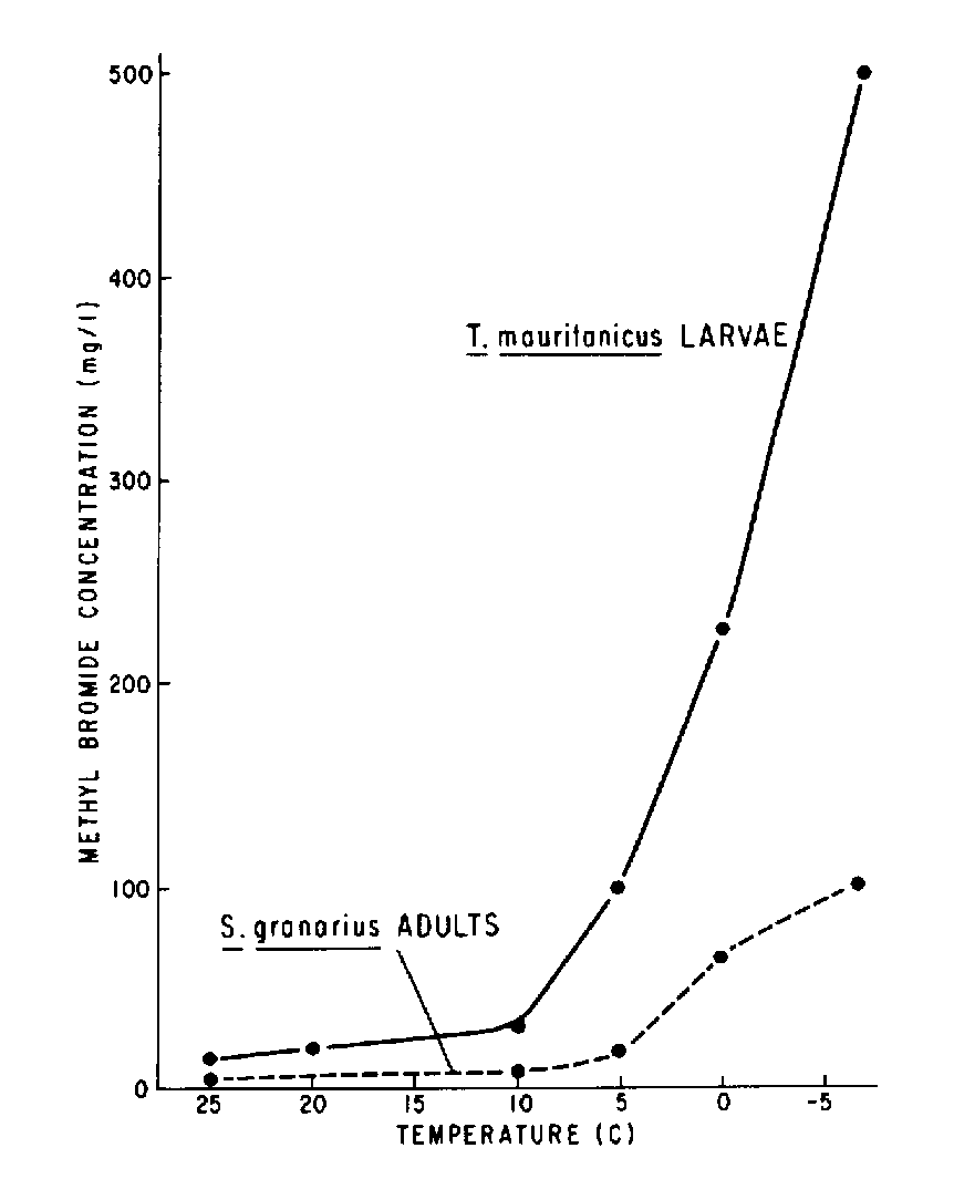 1. For practical purposes, it is increasingly difficult to kill insects with fumigants as the temperature is lowered to 10°C. Below this point, in progression, various species or stages may succumb to low temperature or be weakened by it.