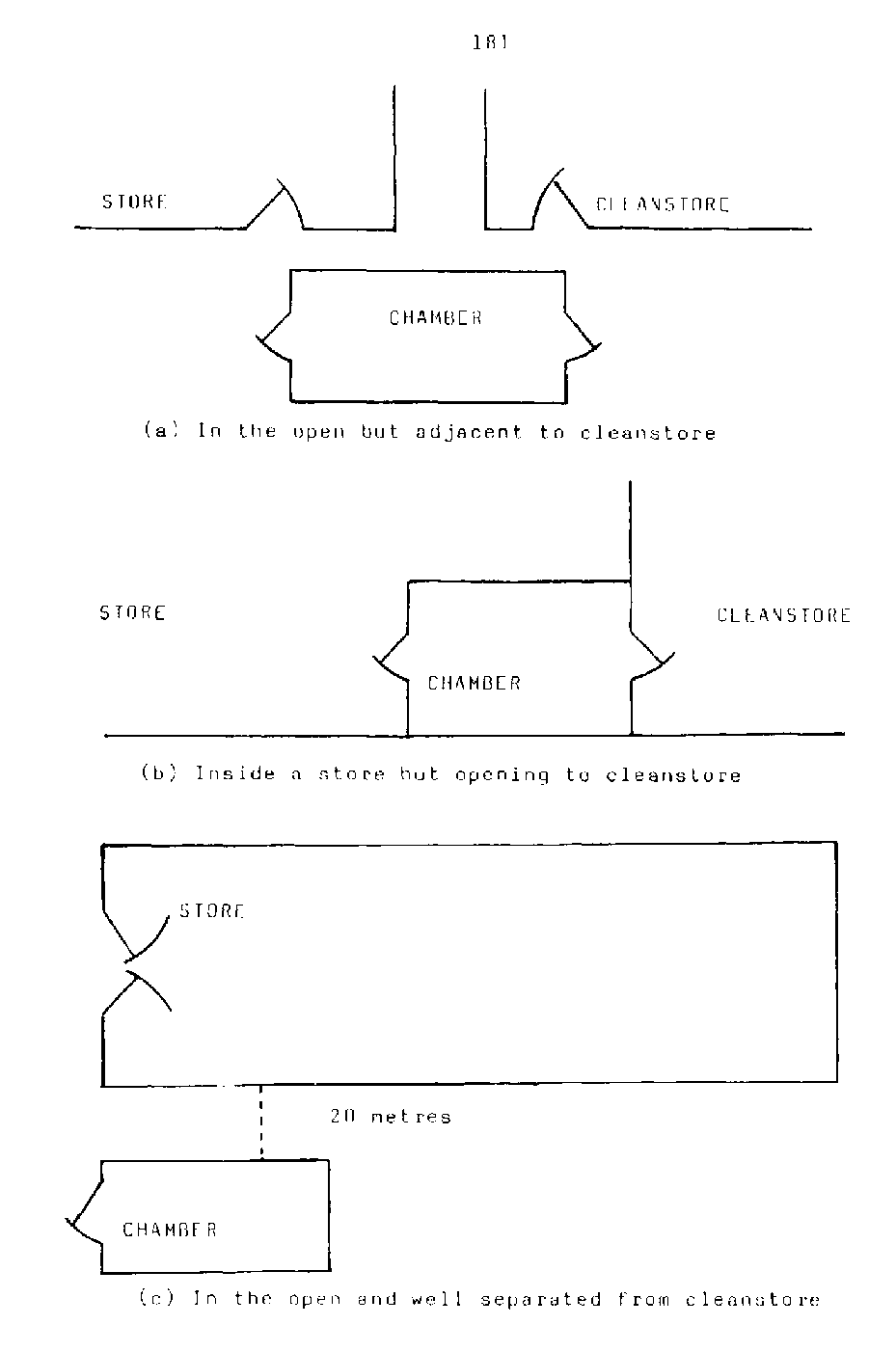 FIGURE 24. - Possible positions for fumigation chamber in relation to storage facilities (UK, 1973)