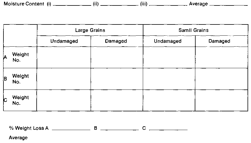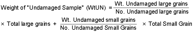 The grains are separated into undamaged and damaged categories, the latter being separated according to cause. Grains in each category are counted and weighed. The resultant data may be substituted in the formula below: