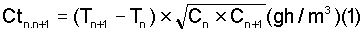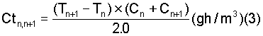 Time step (hours) | Concentration (g/m³) | Ct product (g h/m³) | Cumulative Ct (g h/m³) | Comments |