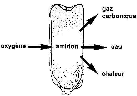 Une graine est un organisme vivant qui respire. Au cours du processus de respiration, l'amidon et l'oxygène produisent aussi bien du gaz carbonique que de l'eau et de la chaleur: