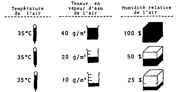Lorsque l'humidité absolue de l'air ne représente que la moitié du taux d'humidité de saturation l'humidité relative de l'air est de 50% si elle ne représente qu'un quart l'humidité relative sera de 25%, etc.