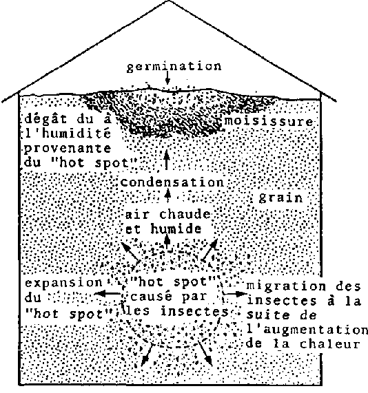 La condensation peut également avoir pour cause une forte infestation d'insectes dans la marchandise, cette infestation étant localement limitée. La respiration des insectes se traduit par une élévation de la température et de l'humidité, ce qui entraîne alors la formation de «hot spots ». Lorsque la température régnant dans ces « hot spots » dépasse 40°C cela devient trop chaud pour les insectes qui émigrent vers des endroits plus frais. Le « hot spot » prend alors de l'extension.