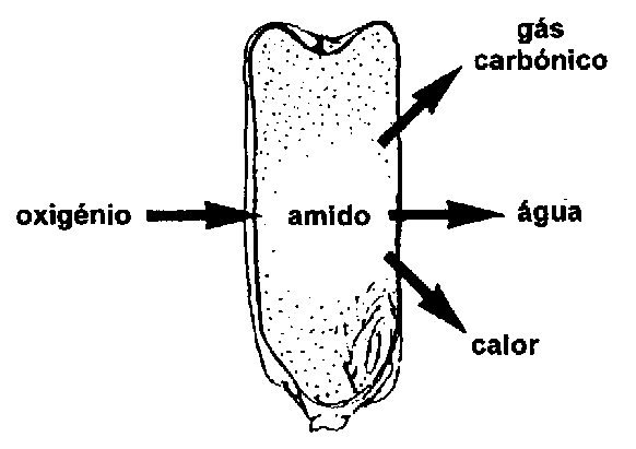 Um grão é um organismo vivente que respira. Durante a respiração, o amido e o oxigénio produzem gás carbónico, mas também água e calor: