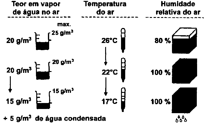 Quando o ar se esfria, diminui a sua capacidade para absorver humidade, o que significa que a teor em humidade de saturação também diminui. No caso de uma quantidade de vapor de água constante no ar, aumenta a taxa de saturação. Consequentemente, aumenta a humidade relativa (veja-se também secção 2.2.3).