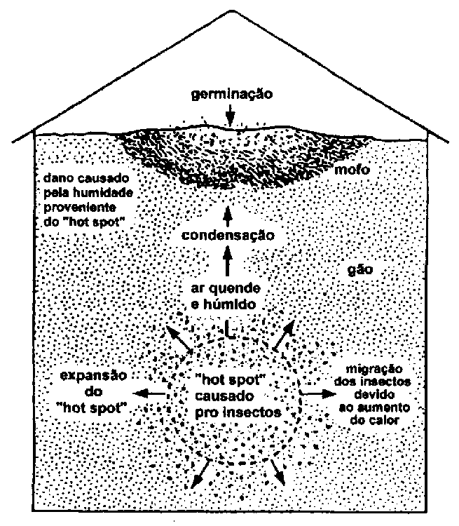 Também pode aparecer condensação por causa de uma praga de insectos em lugares determinados do produto armazenado. A respiração dos insectos provoca um aumento da temperatura e da humidade, resultando na formação de "hot spots" (pontos sobreaquecidos). Quando a temperatura num destes "hot spots" ultrapassar os 40°C, toma-se muito quente para os insectos e eles mudam a lugares mais frescos. O "hot spot" começa então a se expandir.