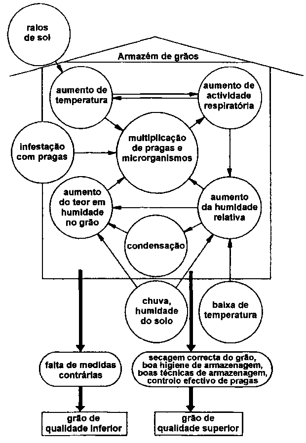 O grão contém água. O teor em água do produto armazenado é variável. Um teor em água superior a um limite seguro que depende do tipo de grão, favorece a infestação com fungos e insectos, o que reduz a duração da conservação do produto.