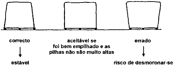 Por razões de estabilidade, não deveriam ser empilhados sacos de juta numa altura maior de 4 m e sacos de plástico só até 3 m! Os sacos de plástico são mais escorregadiços e as pilhas menos estáveis.