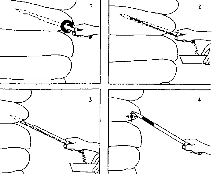 Introduza a sonda de amostras no saco em diagonal por baixo (1), vire a mesma dentro do saco para que o produto possa cair na abertura e passar ao recipiente (2). Retire a sonda (3) e feche o buraco com a sua ponta (4).