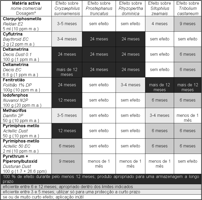 Observações: A permetrina é efectiva contra muitas espécies de pragas que atacam os produtos armazenados, particularmente contra Rhyzopertha dominica e Prostephanus truncatus, embora mostre uma acção reduzida frente às espécies de Tribolium. Ela é muito fiável quando for utilizada em combinação com insecticidas organofosforados, mostrando uma estabilidade prolongada.