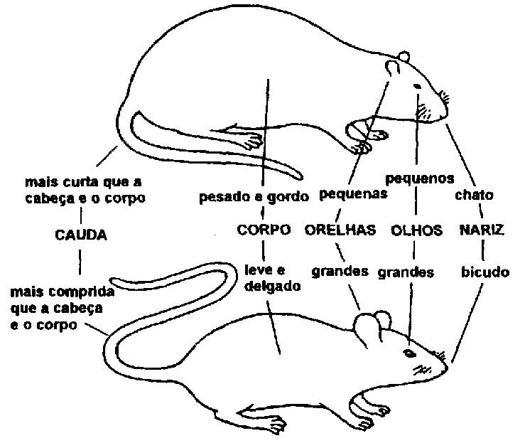 As características distintivas das espécies mais importantes de roedores são indicadas no quadro e na ilustração a seguir.