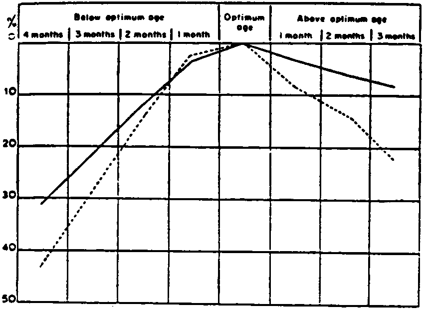 Ce type de stockage permet par ailleurs d'adapter le rythme des récoltes à la consommation. Après dépassement de la période optimale de récolte, la racine perd de sa substance, et notamment de l'amidon, sa composante essentielle du point de vue alimentaire, au fur et à mesure que le stockage se prolonge (cf. figure 14). Elle commence dans le même temps à se lignifier, tandis que l'on observe des altérations de la saveur (LANCASTER et COURSEY, 1984).