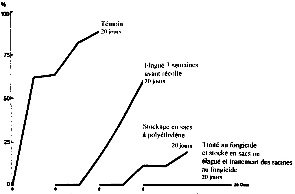 Les racines fraîchement récoltées sont mises dans des sachets. Pour éviter la formation de moisissures et de pourritures, il est recommandé d'appliquer des fongicides avant de refermer les sachets (BEST, 1990). La respiration des racines empaquetées dans ces sachets hermétiquement fermés a pour effet de réduire la teneur en oxygène à l'intérieur des sachets, ce qui se traduit par une meilleure conservation (RICKARD et COURSEY, 1981). Aussi bien les températures élevées (plus de 40° C) que les basses températures (moins de 10° C) ont une incidence positive sur la durée de conservation.