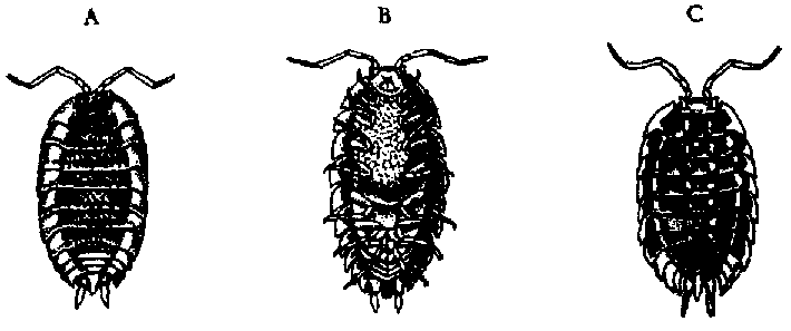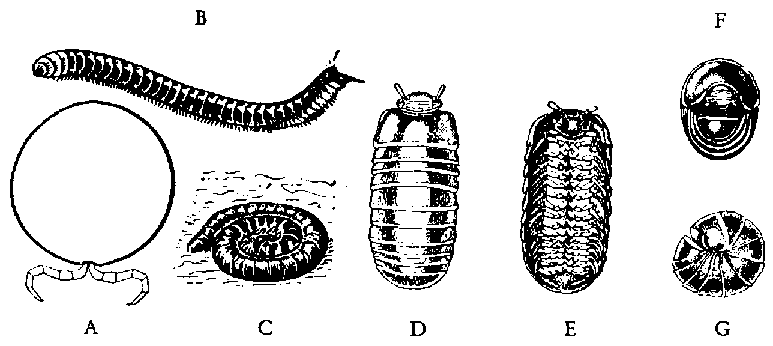 B - Deux paires dé pattes sur chaque segment à partir du Se segment. Corps cylindrique ou semi-cylindrique. Animaux porteurs de 13 à 340 paires de pattes. Des espèces tropicales peuvent atteindre jusqu'à 28 cm (fig. 4) ........ Diplopodes (Diplopoda)