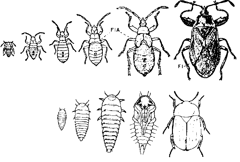 Rangée supérieure: Métamorphose incomplète d'une punaise. Les jeunes larves ressemblent aux adultes, à cette différence qu'elles n'ont pas d'ailes; celles-ci apparaissent peu à peu au cours des stades ultérieurs comme ébauches alaires (FIA) pour acquérir leur complet développement au stade adulte (FI). Rangée inférieure: Métamorphose complète d'un coléoptère. Les larves ont un tout autre aspect que les insectes adultes. Entre le dernier stade larvaire et l'adulte s'intercale un stade de repos, la nymphe (d'après WEBER).