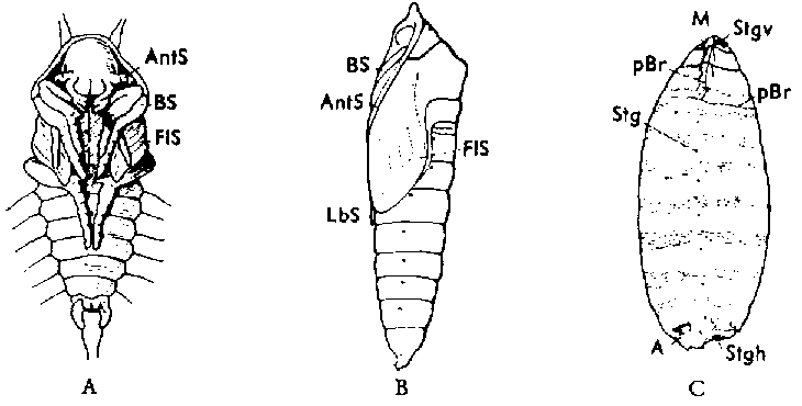 A, nymphe libre d'un coléoptère; B. nymphe obtectée (chrysalide) d'un papillon; C, nymphe coarctée (pupe) d'un diptère brachycère (mouche) (La nymphe proprement dite est enfermée dans la dernière exuvie larvaire). A, anus larvaire; AntS. BS, FLS et LbS = étuis des antennes, des pattes, des ailes et de la trompe; M = bouche larvaire; pBr = ligne préétablie de rupture par laquelle le «couvercle'> de la pupe se détache du tonnelet; Stgv, Stgh = stigmates antérieurs et postérieurs (d'après WEBER).