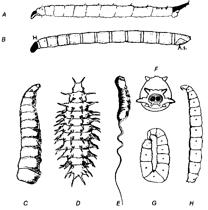 10. Capsule céphalique atrophiée. Extrémité antérieure pointue avec crochets buccaux mobiles d'avant en arrière en lieu et place des mandibules qui se meuvent l'une vers l'autre. 1 paire de stigmates, généralement à l'extrémité postérieure du corps (fig. 12 C-H)....... Larves ou asticots des Mouches, Braichycera