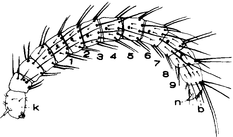 13. Corps en forme de ver ou de chenille, avec pattes et antennes courtes