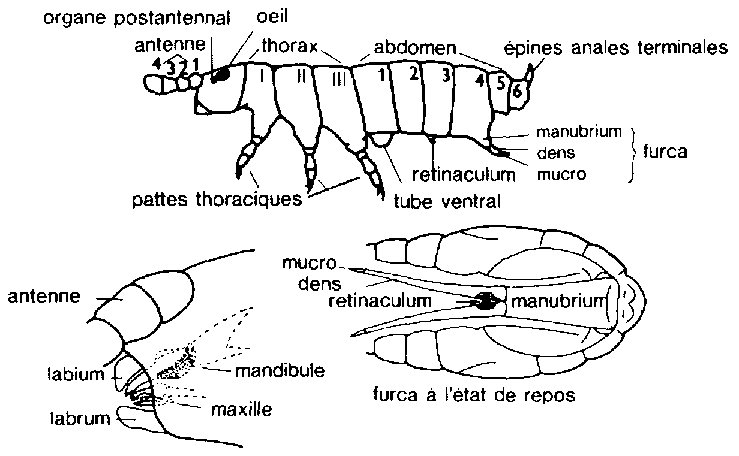 Sur la face ventrale du premier segment abdominal se trouve un organe particulier, le tube ventral. C'est une sorte de tige molle, parfois très longue chez le Symphypleona, formée en réalite de deux tubes soudes et qui peut saillir puis se rétracter à l'intérieur du corps. Les appendices du 4e segment constituent l'appareil de saut, la furca, formée d'une partie indivise, le manubrium, qui se continue par 2 branches (dentés) portant chacune à leur extrémité un petit article, le mucron. Au repos et au cours de la marche, la furca est rabattue contre la face ventrale et maintenue en place par le rétinacle, qui correspond aux appendices du 3e segment. Pour le saut, la furca. mue par sa forte musculature, est détachée du rétinacle, puis brusquement projetée en arrière; elle permet à l'insecte de faire un bond de plusieurs centimètres au-dessus du sol. Au cours du saut, aussitôt après, elle est rabattue sous l'abdomen.
