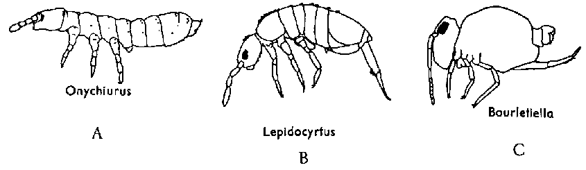 Ces petits insectes mesurent pour la plupart 1-2 mm, mais peuvent atteindre 10 mm chez les plus grandes espèces. Leur corps est tantôt allongé et distinctement segmenté (Arthropleona) (fig. 15 Onychiurus et Lepidocyrtus) tantôt très ramassé et sphérique (Symphypleona) (fig. 15 Bourletiella).
