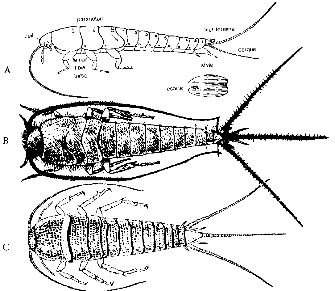 Les lépismes sont de petits insectes aptères, au corps aplati et le plus souvent écailleux, qui, au nombre de 250 espèces environ sont répandus dans le monde entier. Ils mènent une vie cachée dans la terre, sous les pierres, dans les nids des fourmis et des termites. Quelques espèces trouvant un milieu favorable dans les habitations, les magasins, les boulangeries, les cuisines. Il existe davantage d'espèces sous les tropiques que dans les zones tempérées. Ces insectes sont beaucoup plus gênants par leurs pullulations que nuisibles par les dégâts qu'ils causent aux semences, à la farine et aux autres denrées. Ils peuvent aussi nuire aux papiers collés (tapisseries, livres), aux rideaux, à la soie artificielle, etc. Leur petite tête porte des yeux composés, chez Lepisma, de 12 ommatidies. Ils sont complètement absents dans une famille. Les lépismes sont tous aptères, mais les tergites des 2e et 3e segments thoraciques sont prolongés en arrière, des deux côtés, par une expansion paranotale (fig. 18). Les deux derniers segments abdominaux portent chacun, à la face ventrale, 2 styles. Deux cerques et un filament médian sont présents à l'extrémité du corps.