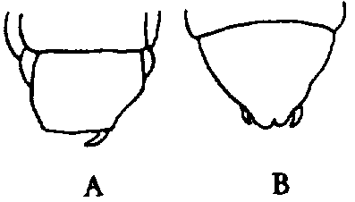 - Tergite du dernier segment abdominal court, triangulaire à sommet émoussé, quadratique, tronqué ou échancré. Pas de bande claire apparente sur le tergite prothoracique (fig. 18 B). .............................................. Ctenolepisma ESCHERICH,1904
