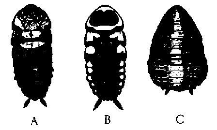 Fig. 24. Larves des Blattes américaine (A), australienne (B) et de Surinam (C).