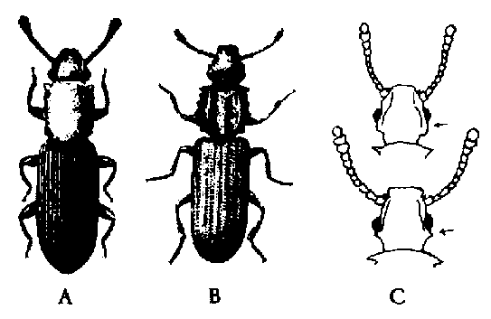 - Noir mat. Pronotum le plus large en son milieu, se rétrécissant progressivement vers ses bords antérieur et postérieur; ses côtés ainsi arqués en dedans vers l'avant et l'arrière. Yeux presque complètement échancrés par le bord explané de la tête, si bien qu'entre l'extrémité de ce dernier et le bord postérieur de l'oeil il reste la largeur de facette (fig. 66 B). Stries ponctuées des élytres faiblement impressionnées en arrière. Lg. 4,5-5,0 mm......................... Petit ténébrion mat, Alphitobius laevigatus (FABRICIUS,1781)