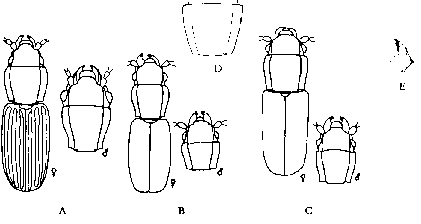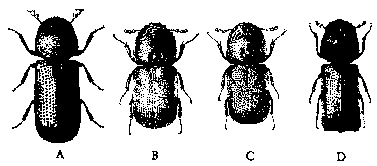 - Elytres avec une déclivité abrupte; vus de dessus paraissent avoir été sectionnés verticalement (fig. 58 D). Brun avec antennes rouges. Lg. 3,5-5,0 mm........................ Prostephanus truncatus HORN, 1878