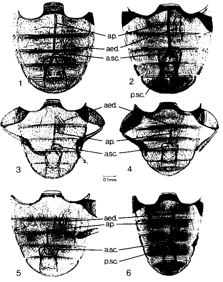 5. Pronotum avec angles postérieurs nettement saillants, en pointe, ses bords latéraux étant légèrement échancrés en avant (fig. 54 A-C)