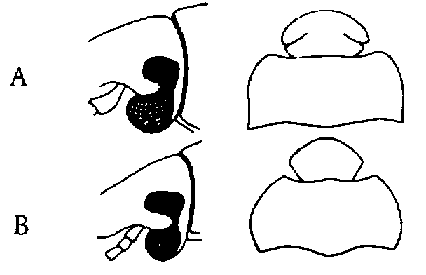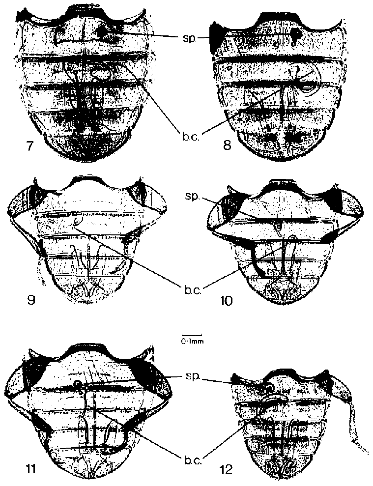 La distinction des espèces d'après les caractères extérieurs n'étant pas toujours facile et souvent impossible à établir avec sûreté, il est nécessaire de recourir à l'examen des armures génitales. Chez le mâle la longueur de l'apodème du 9e segment, qui peut remonter jusque dans le premier segment abdominal ou seulement dépasser le bord postérieur du 2e segment, et la forme du sclérite accessoire, se prêtent particulièrement à cet examen. Chez la femelle, c'est la forme de la partie sclérotinisée de la bourse copulatrice (fig. 56, b.c.). Pour l'étude des structures mâles, l'abdomen est détaché et chauffé à ébulition pendant une minute dans une solution diluée de potasse caustique (voir p. 12), puis aussitôt après bien lavé à l'eau distillée. Il peut être monté entier, à l'aide d'une fine aiguille, dans une goutte de gomme au choral de Berlese aussitôt recouverte d'un couvre-objet (voir p. 13), ou mieux, après élimination des sternites, seul étant prépare l'ensemble des tergites (plaques dorsales). Chez les femelles fraîchement tuées, l'armure génitale peut être extraite par pression de l'abdomen. Avec les femelles mortes, on opérera comme chez les mâles. Les structures sclérotinisées de l'armure génitale femelle ont été désignées comme spermathèque par les premiers auteurs qui y ont eu recours pour la distinction des espèces. Il s'agit en fait de la bourse copulatrice (bursa copulatrix) une poche qui lors de l'accouplement reçoit le spermatophore. Le sperme va ensuite s'accumuler dans le réceptacle séminal ou spermathèqué jusqu'à ce que les spermatozoïdes soient utilisés pour la fécondation des oeufs lors de la ponte.
