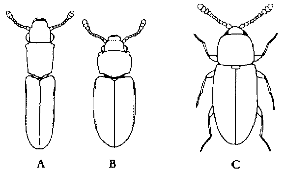 - Rapport de la longueur des élytres à leur largeur de 1,8-1,9:1. Pronotum étroit et peu bombé; écusson plus étroit. Brun foncé, avec antennes et pattes claires. Lg. 3,0 4,5 mm............................................. Tribolium audax HALSTEAD, 1969