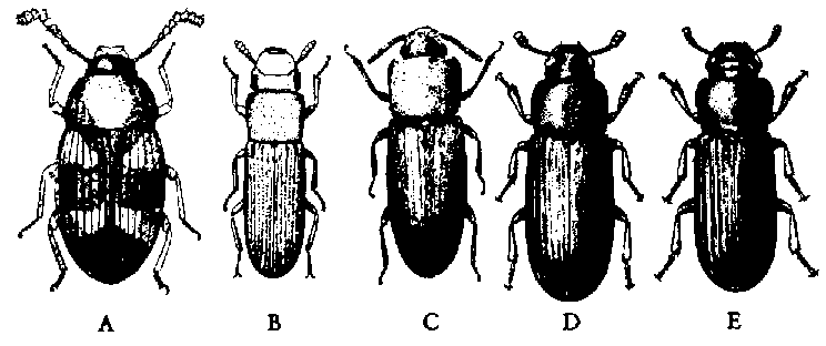- Antennes avec articles terminaux progressivement élargis en une massue plus ou moins distincte de 5-6 articles. Au-dessus des yeux, un épaississement de la capsule céphalique en forme de paupière (fig. 65 B). Yeux échancrés par le rebord explané de la tête de telle façon qu'entre l'extrémité de ce dernier et le bord postérieur de l'oeil il reste la largeur d'une seule facette. Sur les élytres, la fine carène n'est entièrement absente que sur la première interstrie interne, sur les deux interstries suivantes, elle n'est présente qu'en arrière du corps. Brun-roux clair. Tête et pronotum souvent plus foncés. Lg. 2,6 4,4 mm (fig. 63 E)......................................................Tribolium américain de la farine, Tribolium confusum JACQUELINE DU VAL, 1868