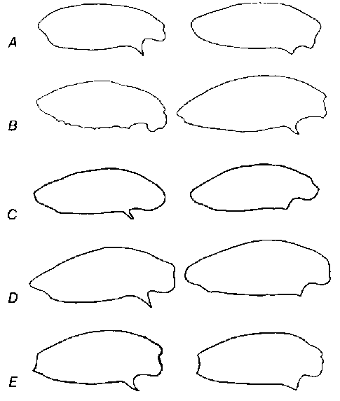 - Épines abdominales terminales dirigées vers le haut, leur pointe incurvée vers l'avant (fig.74E)