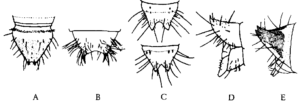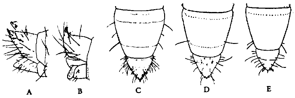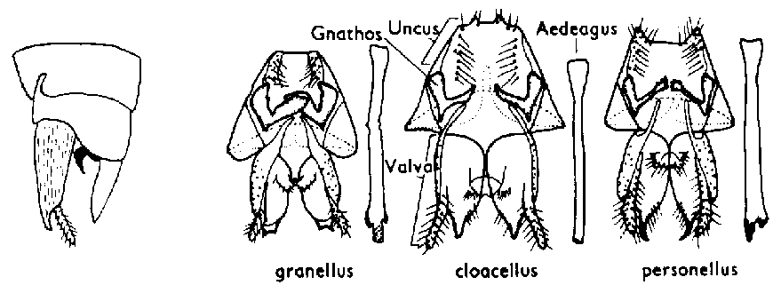 - Chez le mâle, le faisceau terminal de la pilosité du repli costal de l'aile antérieure n'est pas très long. La costa de la valve présente, avant son extrémité, un fort et court appendice conique (fig. 93 B. D). Chez la femelle, le 8e tergite abdominal est membraneux avec ses côtés et son bord antérieur fortement sclérotinisés; le double éventail d'écailles particulières, entre les 7e et 8e sternites abdominaux, est plus court et peu distinct (fig. 94 D, E). Canal copulateur avec 3-6 plaquettes sclérotinisées allongées.