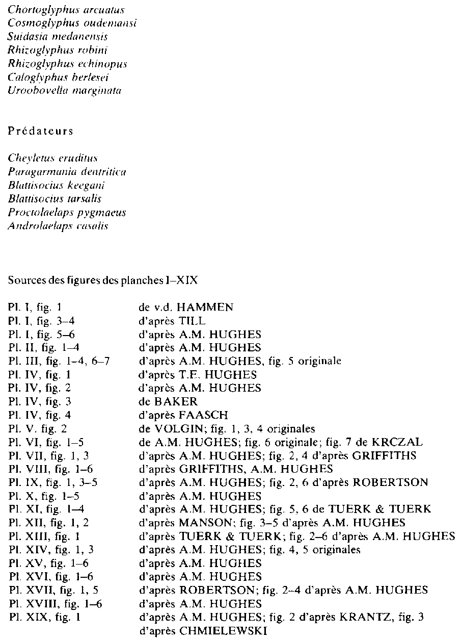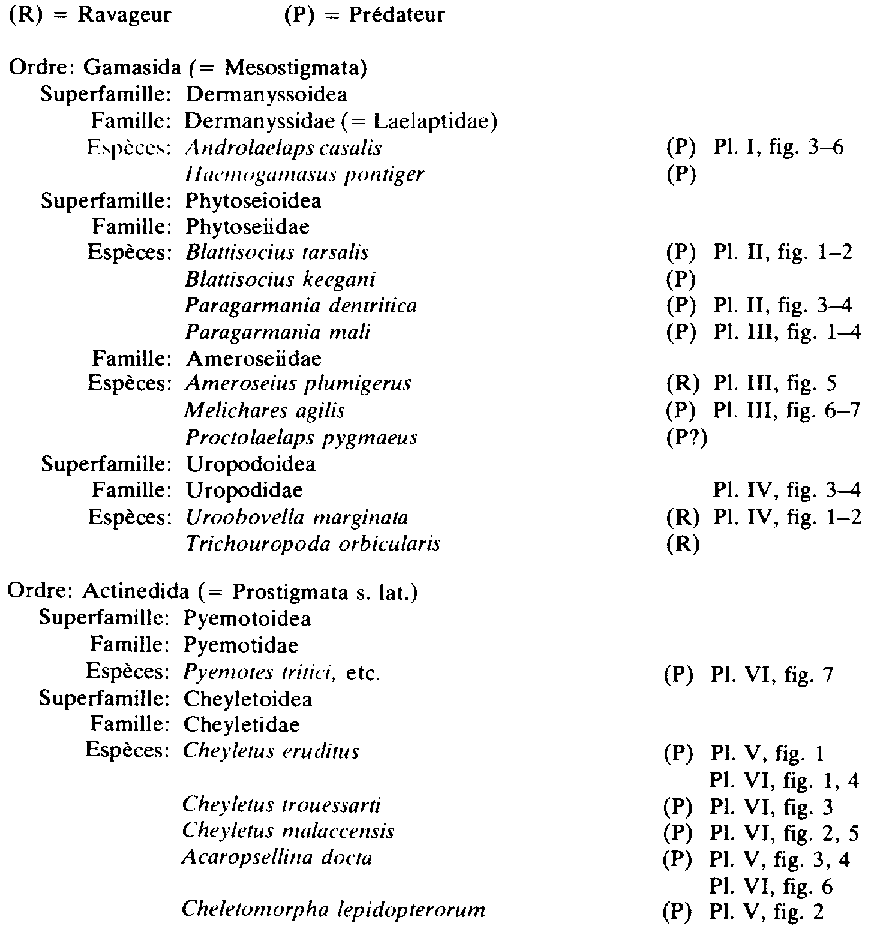 Le nombre des espèces d'acariens nuisibles ou prédateurs que l'on rencontre dans les denrées entreposées n'est pas très grand en regard de celui des espèces parasites de l'homme et des animaux et de celles qui vivent dans le sol, mais il est toutefois trop grand pour que nous puissions les citer toutes. Nous devons nous borner à ne mentionner et représenter que les plus fréquentes d'entre elles.