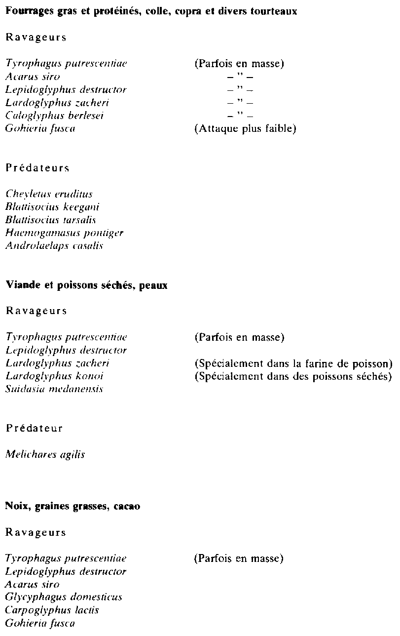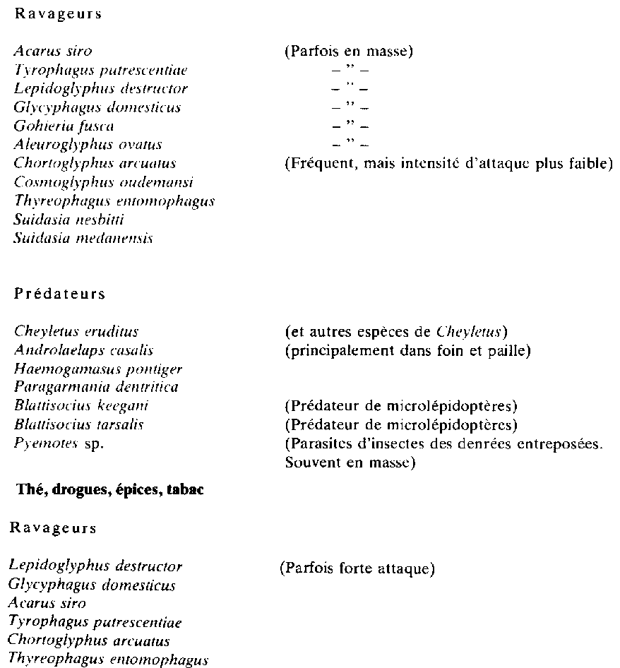 Les acariens que l'on peut s'attendre à trouver dans les denrées entreposées sont cités dans les listes suivantes dans un ordre tel que les espèces les plus fréquentes, à savoir celles sur lesquelles on peut avant tout compter lors de l'examen d'un échantillon, figurent en tête de chacune d'elles, les autres dans l'ordre de leur fréquence. A la fin de chaque liste sont ainsi mentionnées les espèces que l'on observe le plus rarement dans les produits considérés. Ravageurs et prédateurs sont classés séparément et chaque fois dans l'ordre de leur fréquence.