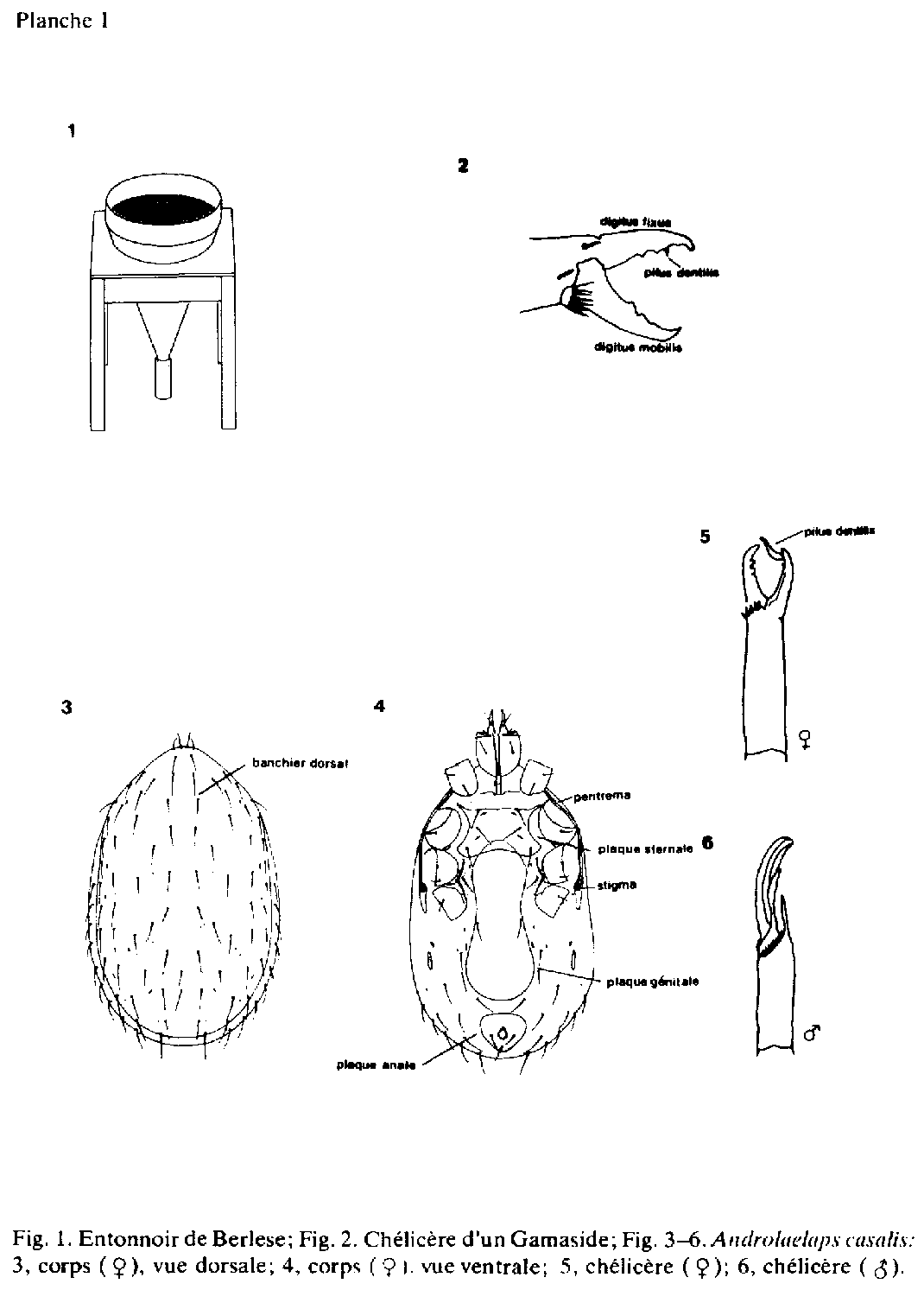 Les acariens doivent tout d'abord être séparés des produits infestés, ce que l'on peut réaliser, suivant le substrat et la quantité disponible, à l'aide des entonnoirs de BERLESE (Pl. I, fig. l) utilisés pour la récolte des acariens du sol. Il est indiqué, si l'on en a la possibilité, de recourir à des entonnoirs de diverses grandeurs munis de tamis plus ou moins fins Avec un substrat très fin, par exemple des produits céréaliers pulvérulents, il est recommandé de déposer sur le tamis une légère couche d'ouate afin d'éviter que trop de particules tombent dans le récipient collecteur. La construction et l'utilisation des entonnoirs de BERLESE sont suffisamment connues pour que nous puissions nous dispenser de les décrire Pour extraire de grandes quantités d'acariens des produits infestés et y apprécier avec exactitude la densité de leurs populations, des méthodes ont été décrites et publiées. Le plus souvent, il suffira, et cela sera nécessaire lorsque les acariens sont morts, d'examiner les produits infestés à l'aide d'un microscope stéréoscopique. Les acariens seront capturés à l'aide d'une fine aiguille, dont la pointe a été trempée dans de l'alcool ou de l'acide lactique, puis transférés dans une petite soucoupe ou dans une goutte d'acide lactique à 50% sur un porte-objet Cette méthode est suffisante pour l'appréciation qualitative d'une infestation et pour une estimation approximative de la densité de l'attaque, si bien que l'on peut renoncer à une séparation par lavage. En raison de leur petitesse et du grand nombre d'espèces difficiles à distinguer, les acariens ne sont pas d'une détermination facile. Au mieux, on fera des préparations microscopiques dans un milieu spécial, la gomme au chloral de BERLESE (voir p. 13). Dans quelques cas, on pourra se contenter d'un examen rapide dans de l'acide lactique à 50%, après que les animaux sous le couvre-objet auront été chauffés avec prudence. Mais dans la majorité des cas, on devra s'adresser à un spécialiste.