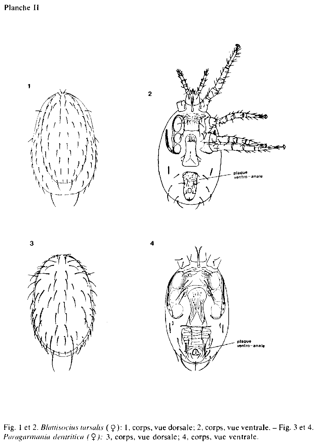 3. Avec des yeux. Pattes antérieures très longues, à leur extrémité dépourvues d'ongles et de lobes adhésifs. Rougeâtre. Lg. 0,3-0,6 mm. (Pl. V, fig. 2)............................ Cheletomorpha lepidopterorum (SHAW 1794)