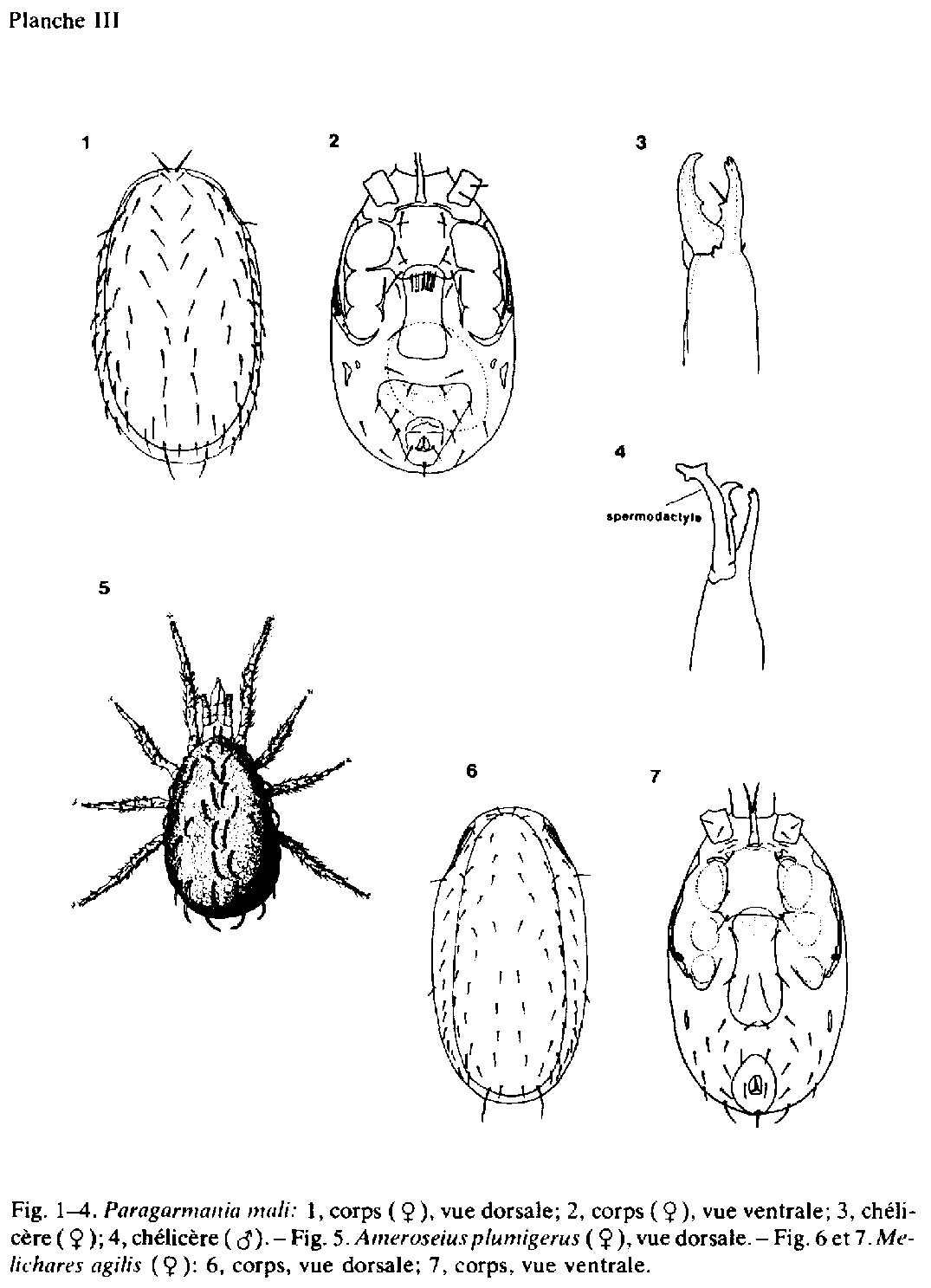 Adultes. Femelle: Les plus importants caractères morphologiques des femelles sont: la grande ouverture génitale qui se trouve entre les coxae III et IV, les quatre paires de soies adanales et les deux paires postanales, la présence d'un orifice ou d'un tube copulateur à l'extrémité postérieure du corps.