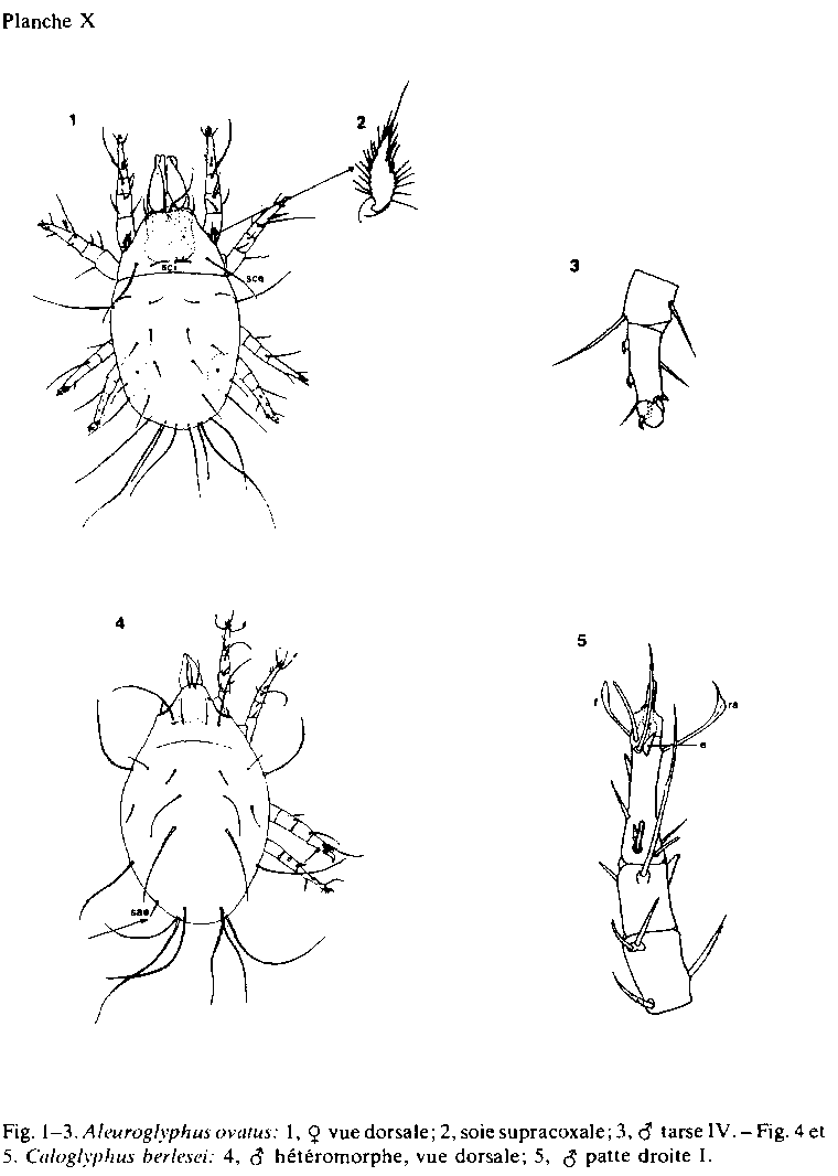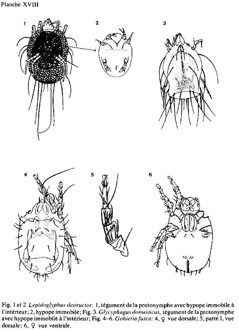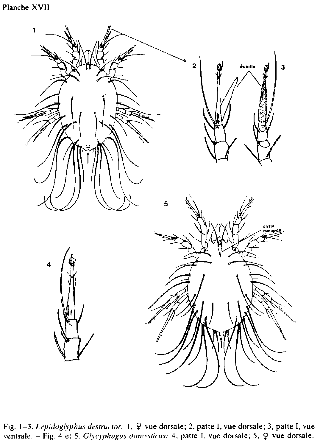 - Article terminal des pattes sans écaille velue. En avant, sur le milieu du dos, une crista metopica (Pl. XVII, fig.5). Corps arrondi, blanchâtre, long de 0,3-0,75 mm..............Glycyphagus domesticus (DE GEER, 1778)