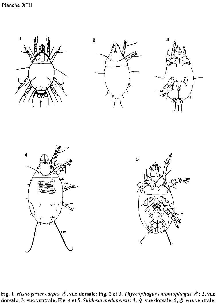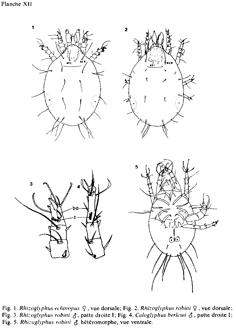 Polymorphisme des mâles: Chez les représentants de quelques genres, par exemple Caloglyphus, Rhizoglyphus et Schiwiebea, se manifeste un remarquable polymorphisme des mâles, qui ne doit pas être confondu avec le dimorphisme sexuel normal. A côté des mâles homéomorphes, dont les pattes sont normalement constituées comme celles des femelles, peuvent apparaître, selon la terminologie de TUERK et TUERK (1957), des mâles Bi-, hétéro- et pléomorphes, soit seuls, soit avec des mâles homéomorphes. Ils se distinguent des femelles et des mâles normaux, soit seulement par de plus longues soies du corps (bimorphes), soit par des pattes III nettement plus renflées dont les tarses sont transformés en organes semblables à des ongles (hétéromorphes). Enfin, il se peut que les soies du corps soient plus longues que celles des femelles et que les pattes III soient renflées (pléomorphes). Les quatre types de mâles n'ont jusqu'à maintenant, jamais été observés chez une seule espèce.