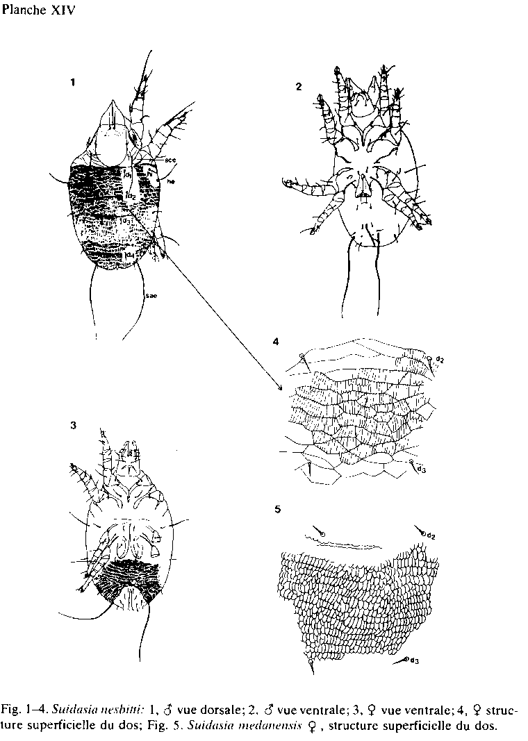 8. Surface du corps finement striée longitudinalement et simultanément divisée en champs transversaux irréguliers (Pl. XIV, fig.4). Les soies he sont beaucoup plus longues que les très courtes soies hi (Pl. XIV, fig.1). Mâle sans ventouse anale. Lg.0,27-0,34 mm....... Suidasia nesbitti HUGHES, 1948