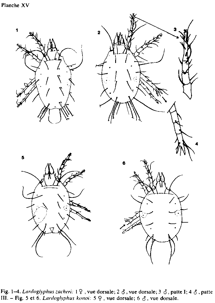 Sur produits d origine animale, tels que os, peaux, fourrures, déchets d'abattoirs. Soies dorsales d3 et d4 à peu près de même longueur. Les première et seconde paires de pattes avec un seul ongle (Pl. XV, fig.6). De même couleur et grandeur que l'espèce pré cédente, mais corps un peu plus arrondi.......................................... Lardoglyphus konoi (SASA & ASANUMA, 195-1)