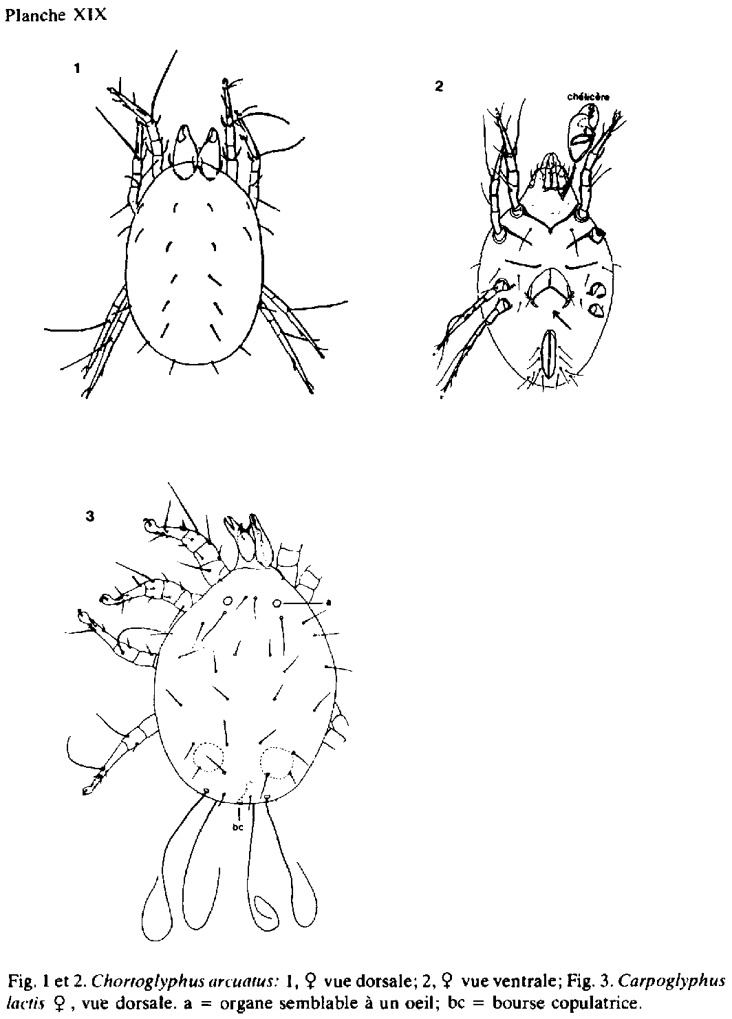 - Quatre très longues soies à l'extrémité du corps. Région génitale de la femelle normale. Tous les stades de développement possèdent dorsalement, de chaque côté de la partie antérieure du corps, un petit organe semblable à un oeil simple (Pl. XIX, fig. 3). Lg. 0,35-0,44 mm. Corps incolore, vitreux Acarien du pruneau, Carpoglyphus lactis (LINNÉ, 1758) Connu sous le nom anglais de "dried fruit mite", cet acarien cosmopolite est un ravageurs important des fruits secs, tels que pruneaux, raisins, pêches, abricots, figues. bananes, dattes, etc.