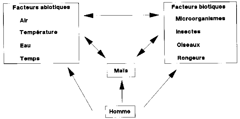 Le stockage du maïs récolté peut être conçu en tant que processus biologique (voir à ce propos STEIN 1986, MULTON 1982b, TROUDE 1982 et CALDERON 1981), dont l'équilibre, instable, est soumis à diverses influences anthropogènes (figure 3.2). Le grain lui-même, ainsi que les facteurs biotiques et abiotiques, sont les éléments déterminants du système. En tant qu'élément agissant consciemment, l'homme est en mesure d'intervenir dans ce système biologique à tout instant et en tout lieu.