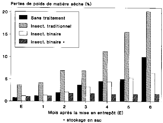Les chiffres de pertes minimes de la variante de stockage en sacs montrent bien l'efficacité des insecticides binaires au niveau de cette méthode de stockage. A l'issue d'une période de stockage de huit mois, les pertes étaient en effet de 2 % environ. Le fait que 50 % des entrepôts abritant des sacs étaient infestés par Prostephanus truncatus permet de conclure à l'efficacité des insecticides binaires contre ce ravageur des stocks. Ce résultat est confirmé par les essais plus récents effectués par le Service National de la Protection des Végétaux. En présence d'une infestation artificielle, les pertes subies après traitement aux deux composantes pirimiphos-méthyl et deltaméthrine étaient d'env. 5 % à l'issue d'une période de stockage de 8 mois.