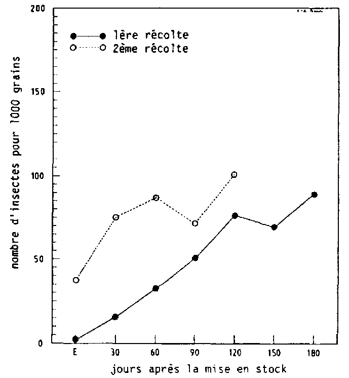 De manière globale, l'infestation causée par les insectes durant la petite saison de stockage a atteint en moyenne 101,4 insectes/1000 grains au 120ème JME, alors que les échantillons de la grande saison de stockage ne recelaient au terme de la même période que 76,2 insectes/1000 grains. Il n'a cependant pas été possible de fixer cette différence avec certitude en raison du fait que la croissance des populations durant la grande saison de stockage a été 10 fois plus rapide.